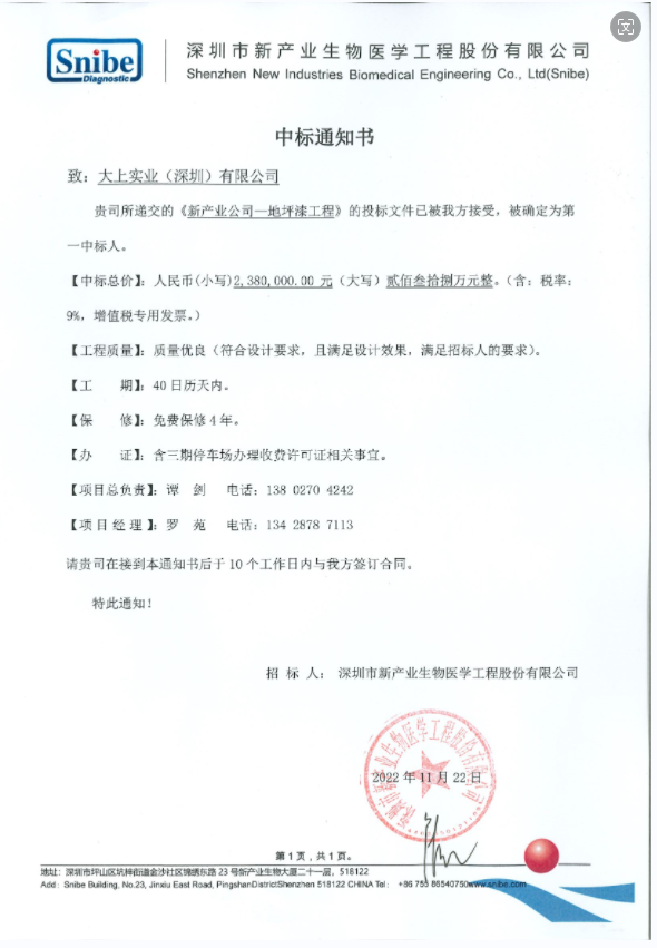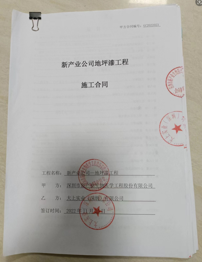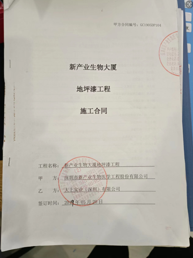 我司大上實業于2019年有幸城建“新產業生物大廈地坪漆工程”,后因工程質量好,使用三年仍然如新,甲方于2022再次邀請我司投標,我司再次幸運中標,2019年及2022年簽訂合同工程金額及簽證款總額超500萬元。