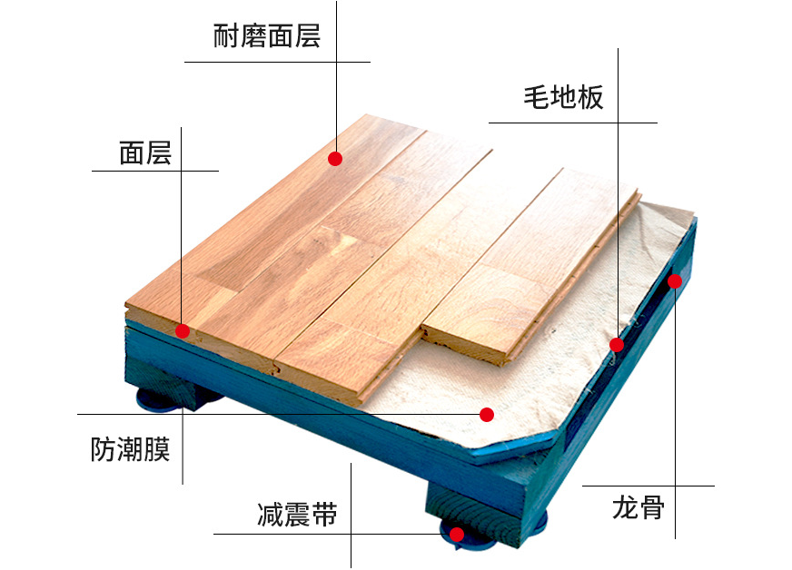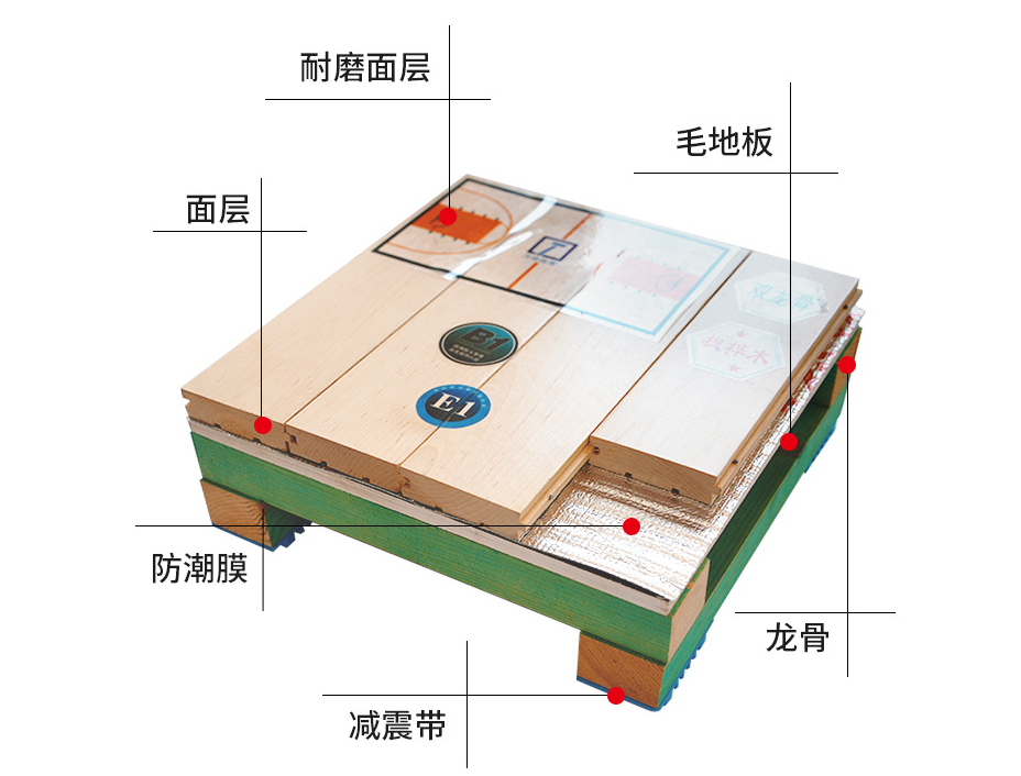 2. 雙層結(jié)構(gòu)運(yùn)動(dòng)木地板:這種木地板由面層地板、毛層地板、龍骨層、防潮層和彈性膠墊層等材料組成的復(fù)合結(jié)構(gòu)形式。
