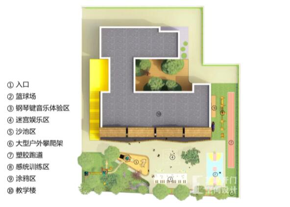園區戶外設計中將音樂元素和涂鴉藝術融合,藝術造型配上五彩斑斕的童趣色彩,調皮而又靈動。“紅黃藍”三色籃球場極其奪目,讓孩子們對色彩的認知融入到運動娛樂之中。