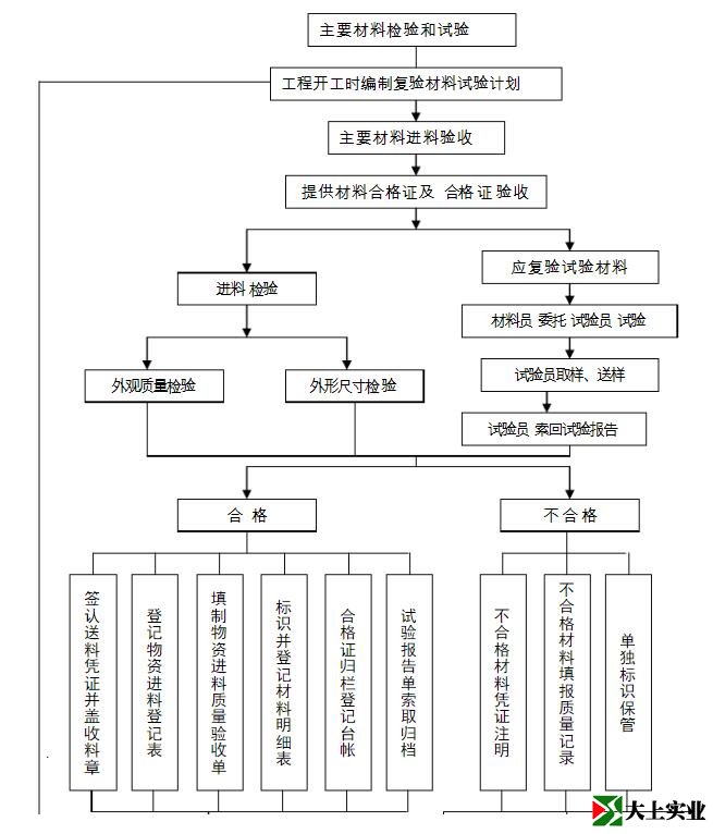 2、工程材料進場實行復檢制度,材料進場時由材料員、質檢員、現場試驗員共同驗收,查驗出廠合格證,對原材料、半成品進行外觀檢驗,并按照有關規定進行取樣復試,只有經過復檢合格的材料方可使用,杜絕使用不合格材料。