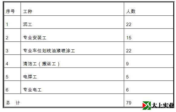 3、根據本工程實際情況,按照專業、高效選擇施工隊伍參與工程施工原則,整個工程擬安排車庫地坪、標志、標牌、標線、設備安裝、綜合專業施工隊共六個。各專業施工隊按照