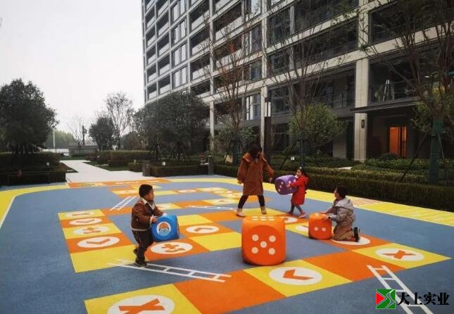 杭州玖樟臺蛇形棋游樂場通過塑膠地墊中加入蛇形棋盤、兒童跑道、跳遠等圖案,結合定制骰子軟裝為小業(yè)主提供趣味活動的想象空間。
