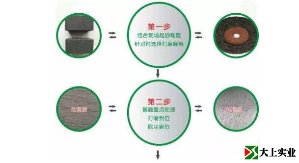 用金剛磨頭或磨石磨頭打磨表層至符合施工水性聚氨酯地坪層對基面的要求,方可按實際情況要求施工水性聚氨酯地坪