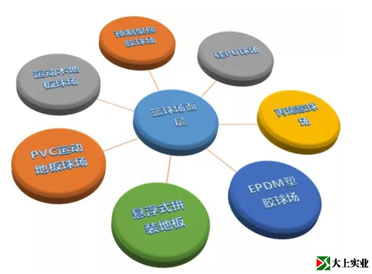 大上實業(yè)小編就通過一張圖介紹籃球場面層材料的分類,再詳細(xì)論述各種材料面層的特點,讓您對如何選擇籃球場面層材料做到心中有數(shù)。羽毛球場、排球場等也可參照這些標(biāo)準(zhǔn)選擇。