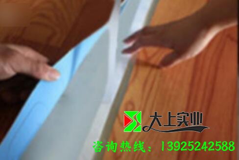 4.然后在地板與地板的接縫中間粘貼雙面膠,將雙面膠壓平,防止地板膠不平整。