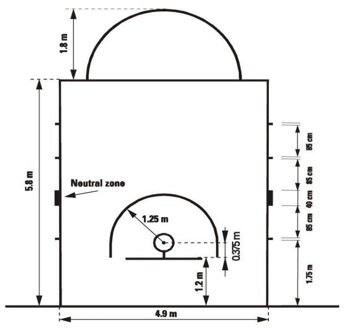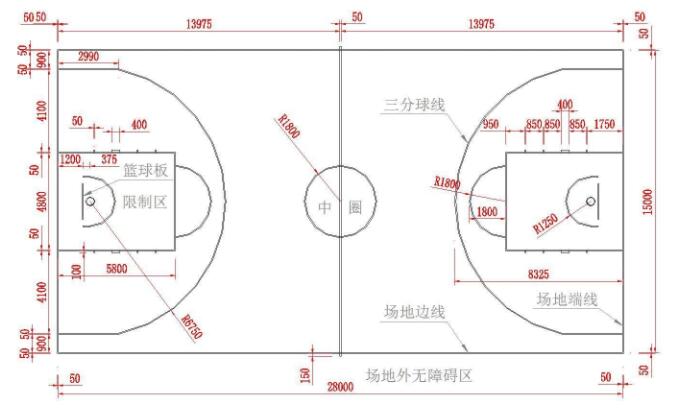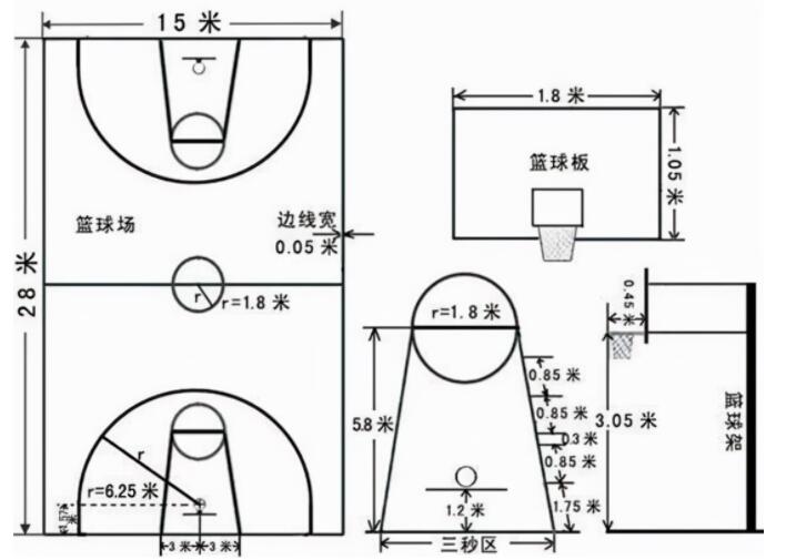 籃球比賽的場地是一個長方形的堅實地面,它的中間不能有任何障礙物,籃球場的長為28米,寬為15米。