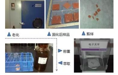 按照推薦性國家標準《合成材料跑道面層》對送檢試樣的要求,樣品應在固化14天后進行測試.因事情緊急,為更客觀地檢測操場情況,將樣品放入烤箱加速其固化,剪樣、稱重、萃取。