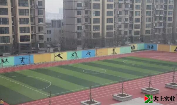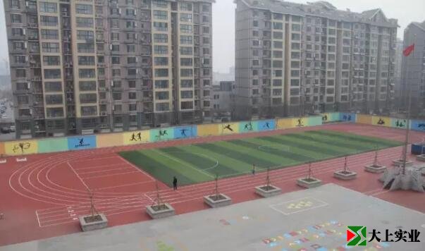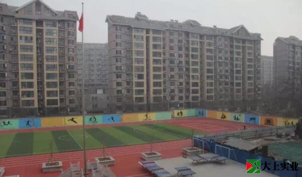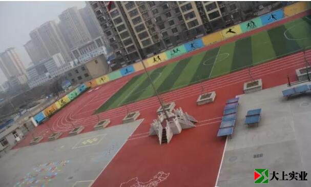 竣工了,從教學樓上俯視,紅色的地膠和綠色的足球場,相互輝映,漂亮極了。