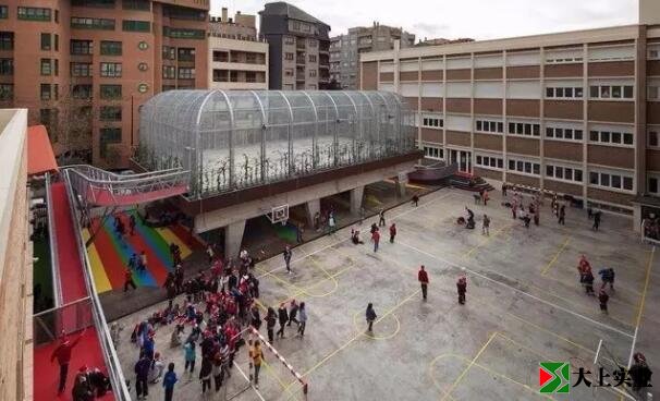 Lasalle Franciscanas學(xué)校位于西班牙Zaragoza,其操場(chǎng)經(jīng)常用于學(xué)生的課間娛樂(lè),課外活動(dòng)以及孩子們與家長(zhǎng)間接送的集散空間。于是常常造成使用上的重圖,進(jìn)出校門(mén)的人群與操場(chǎng)上正在活動(dòng)的學(xué)生間的相互干擾。于是當(dāng)?shù)豃1 arquitectos 事務(wù)所的建筑師Guzman de Yarza Blache被委以此任,要求在擴(kuò)大33*35米操場(chǎng)的使用面積的同時(shí),在不影響學(xué)校日常體育和休閑活動(dòng)的前提下,滿(mǎn)足接送家長(zhǎng)人員流動(dòng)的需求。
