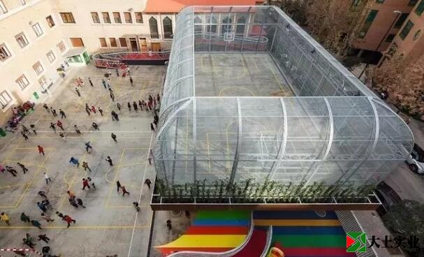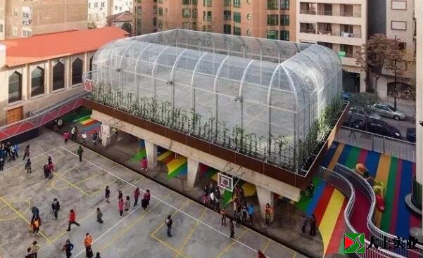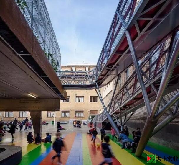 在擁擠的城市中,空中跑道顯得格外醒目。這一智慧的概念,緣于場(chǎng)地極為有限的用地面積。土地有限,但是學(xué)生們需要有一個(gè)活動(dòng)的空間······