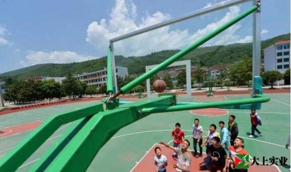 6月6日,??悼h馬橋鎮中坪村小學學生在塑膠運動場上打籃球。中坪村小學是全縣唯一一所擁有塑膠運動場和標準籃球場的村級學校。該校塑膠運動場總投資172萬,面積3500平方米,于2016年5月30日開始建設,將原來的水泥場地墊高1.5米,壓實,上面鋪塑膠、硅膠,2016年11月竣工,并交付學校使用。