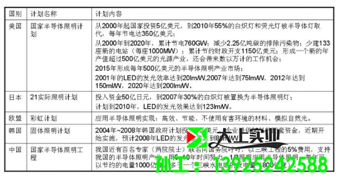 2、由于同自熾燈、R光燈、氣體放電燈等光源相比LED具有巨大的優(yōu)勢,10~20年后它將替代它們,主宰整個照明行業(yè)。各國都投入大量的人力、財力資源啟動半導體照明計劃如表