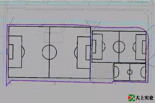 項目位于寧圍初中西側,改造為足球場。場地整平后采用12cmC25砼硬化,加鋪人造草坪。區塊分為十一人制足球場、七人制足球場、五人制足球場及功能區塊。采用人工草坪形式建設,沿足球場四周新建圍欄、路燈等。