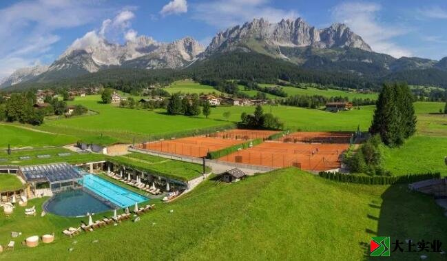 奧地利生態酒店的網球場,坐落在迷人的奧地利阿爾卑斯山腳下,除了6個室內網球場外,還有8個室外紅土網球場。