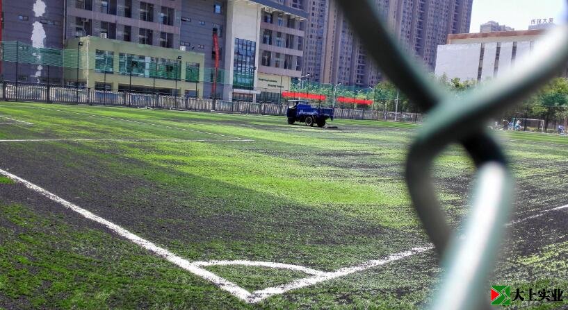 人工草皮都在鋪設了呢!場上是三輪車拖著橡膠顆粒包裝袋在撤橡膠顆粒。